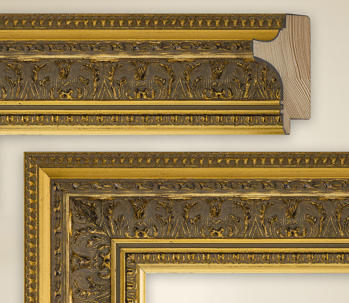 | Den imponerende Nelly-maleriramme præsenterer sig selv i ethvert billedgalleri, men også hos enhver privat samler, der sætter pris på sublime rammer til sine kunsttryk. Van Gogh-rammeserien præsenterer med denne model endnu en guldramme, som designerne har skabt i farve, form og design med forskellige lister til et pragtfuldt stykke. På en samlet bredde på 79 mm er borderne her vist nogle gange med, andre gange uden ornamenter, men altid snedigt koordineret med hinanden og bragt i en seværdig rækkefølge. I den ydre kant begynder Nelly med den første smalle pyntebort, som viser små trekantede kædeledninger på en mørkebrun bund. En guldfarvet fordybning viser vej til den højeste del af rammen, der skubber sig ind i rummet som en kantet tunge på 43 mm. Også her kommer guldelementer på brun farve til sin ret som dekoration, inden den store hovedbort skubbes tilbage mod væggen. Her dominerer den mørkebrune farve, således at de gyldne strukturer på denne ser meget filigran ud. Guld, brun, guld er navnene på de næste smalle striber, der igen ledsages af endnu en ornamental kant, inden en sidste guldstribe danner den kollektive afslutning. I det samlede billede dominerer den mørkebrune farve, som danner et fremragende sammenspil med det skinnende guld. |