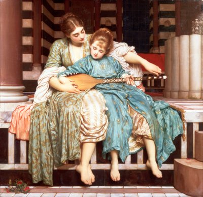 Allerede som 11-årig, dvs. i 1841, blev Frederic Leighton, 1. baron Leighton, undervist i maleri i Rom og studerede derefter først på akademiet i Berlin, fra 1844 i Firenze hos Giuseppe Bezzuoli (1784 - 1855) og derefter hos Eduard Jakob von Steinle (1810 - 1886) på Städelsches Kunstinstitut i Frankfurt am Main. Den unge Frederic Leighton blev først og fremmest påvirket af nazaræerne og malerne fra den italienske renæssance, hvoraf en af dem inspirerede Leighton til at male sine to første store malerier: Giotto, mødt blandt Cimabues får (1847) og Cimabues Madonna i procession (1852-1855). Sidstnævnte blev sendt af Leighton til Royal Academy, da det var færdigt, og det var også hans gennembrud som kunstner.