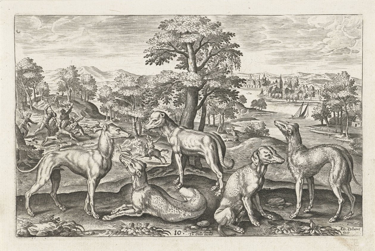 jagthunde Firebenede dyr (serietitel) Animalivm Qvaddrvpedvm (serietitel)(Jachthonden Vierpotige dieren (series title) Animalivm Qvaddrvpedvm (series title))Adriaen Collaert(print maker),Adriaen Collaert(after design by),Theodoor Galle(publisher) |