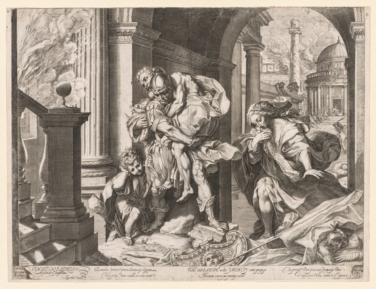 Aeneas og hans familie flygter fra Troja, 1595.(Aeneas and His Family Fleeing Troy, 1595. )Agostino Carracci |