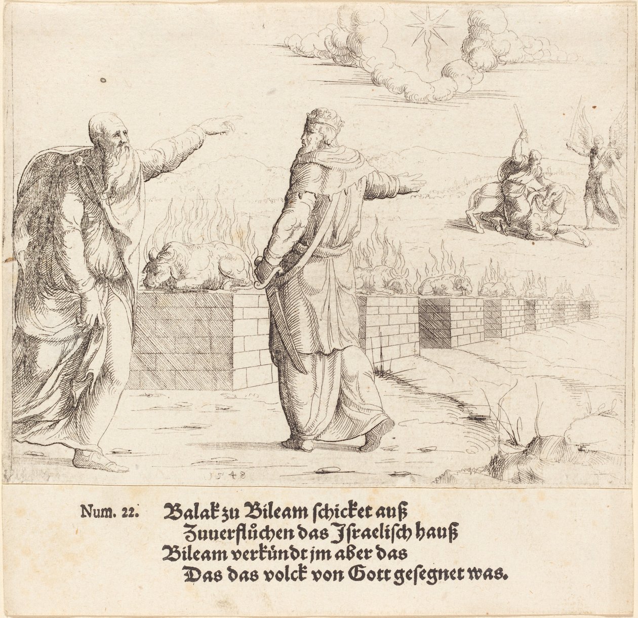 Balaks offer og Bileams profeti, 1548.(Balak's Sacrifice, and Balaam's Prophecy, 1548. )Augustin Hirschvogel |