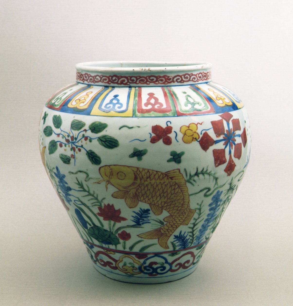 Kugleformet krukke dekoreret med fisk og blomster, Chia Ching-perioden (1522-66)(Globular jar decorated with fish and flowers, Chia Ching period (1522-66))Chinese School |