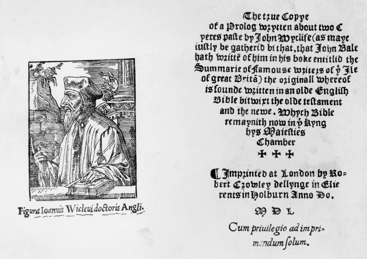 Frontispice af 'The Summary of Famous Writers of the Isle of Great Brita' forestillende John Wycliffe (ca. 1330-84), 1550(Frontispiece of 'The Summarie of Famouse Writers of the Ile of Great Brita' depicting John Wycliffe (c.1330-84), 1550 )English School |