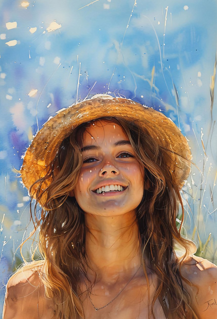 Dette billede blev skabt med hjælp fra generativ AI. 2024 · Digital art · Billed-ID: 1521897 Et fængslende billede af en smuk kvinde med hat og flagrende brunt hår, der er blidt pjusket af havbrisen. Omgivelserne ved havet forstærker scenens elegance og naturlige skønhed.