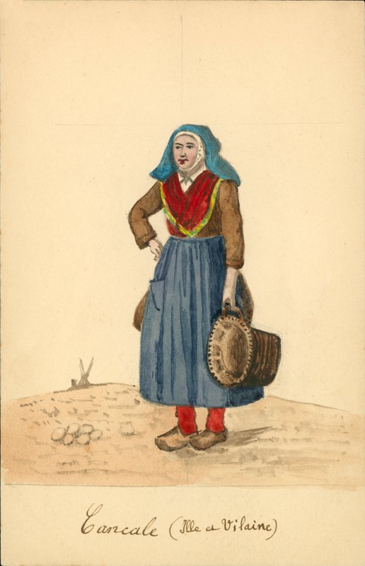 Kvindedragt fra Cancale, Ille-et-Vilaine (farvelitografi)(Women's costume of Cancale, Ille-et-Vilaine (colour litho))French School |