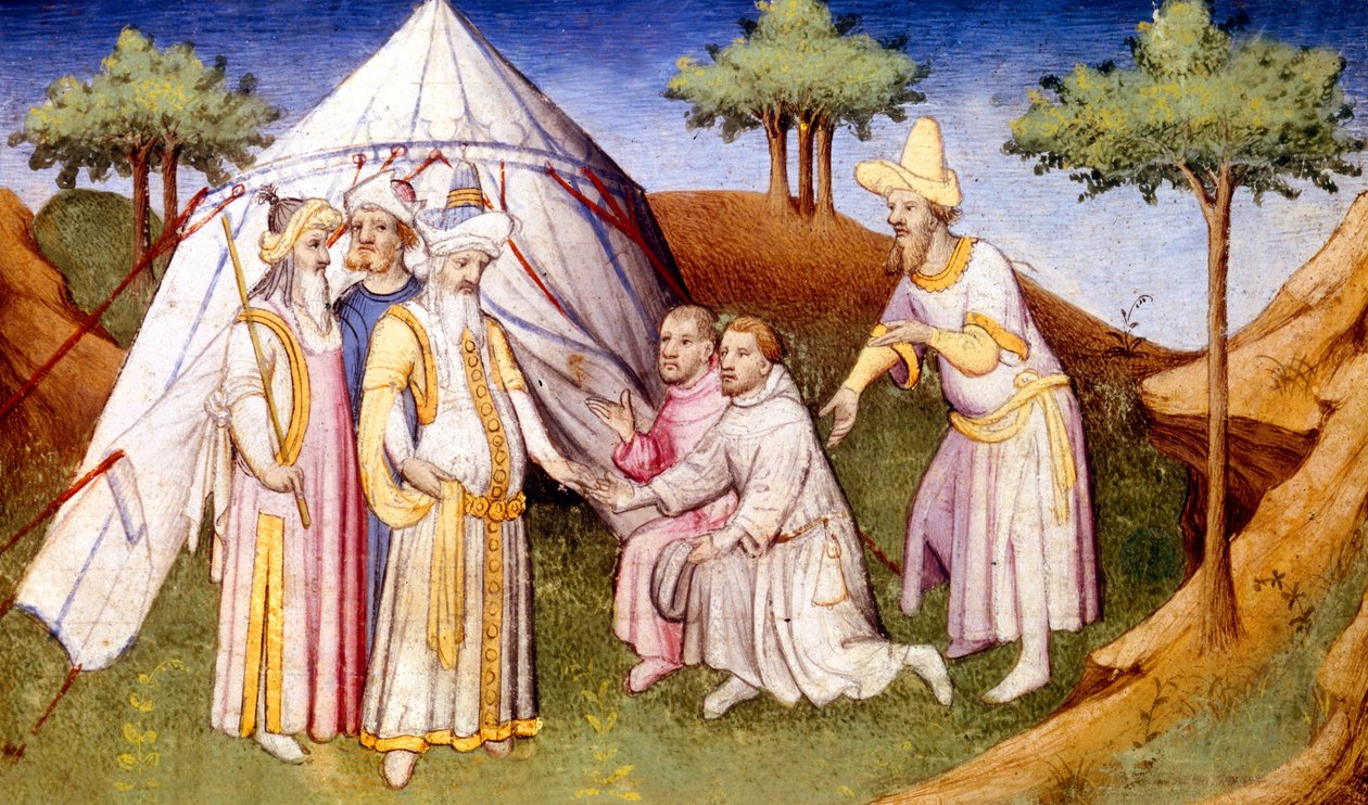 Fr 2810 f.2v, Kublai Khan mødt af brødrene Polo, fra Book of Wonders of the World, c.1410-12 (tempera på vellum)(Ms Fr 2810 f.2v, Kublai Khan greeted by the brothers Polo, from Livre des Merveilles du Monde, c.1410-12 (tempera on vellum))French School |