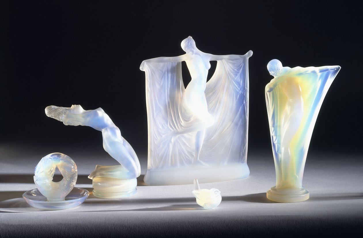 Tre opaliserende glasobjekter af Lalique,(Three Opalescent Glass Objects by Lalique,)French School |