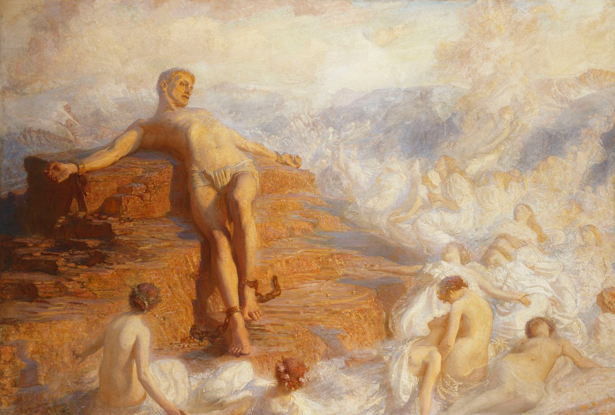 Prometheus trøstet af jordens ånder 'Hvor smukke disse luftbårne former! Og dog føler jeg mig mest forfængelig alt håb undtagen kærlighed...' -Shelley.(Prometheus Consoled by the Spirits of the Earth 'How Fair These Air-Borne Shapes! And Yet I Feel Most Vain All Hope But Love...' -Shelley.)George Spencer Watson |