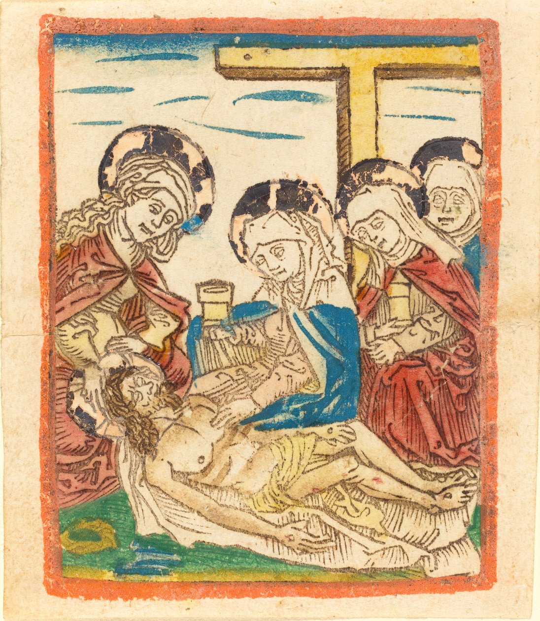 woodcut in dark brown, hand-colored in red-lake, blue, green, yellow, tan, gold, and orange