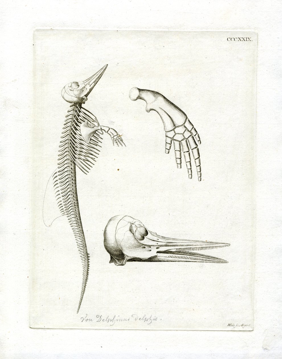 Delfinskelet (farvet gravering)(Dolphin Skeleton (coloured engraving))German School |