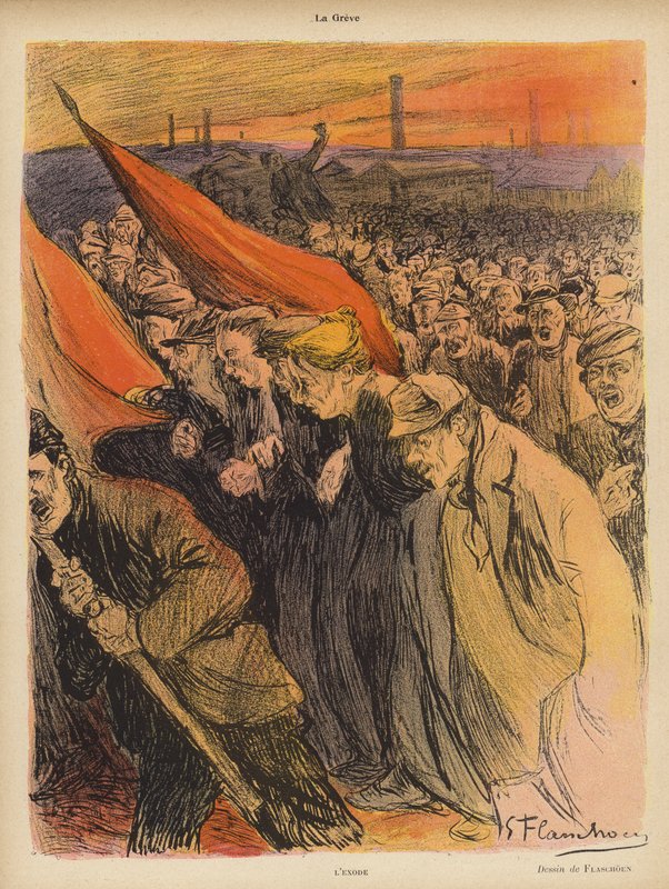 Industriel strejke: The Exodus, ca. 1902 (farve litho)(Industrial strike: The Exodus, c.1902 (colour litho))Gustave Flasschoen |