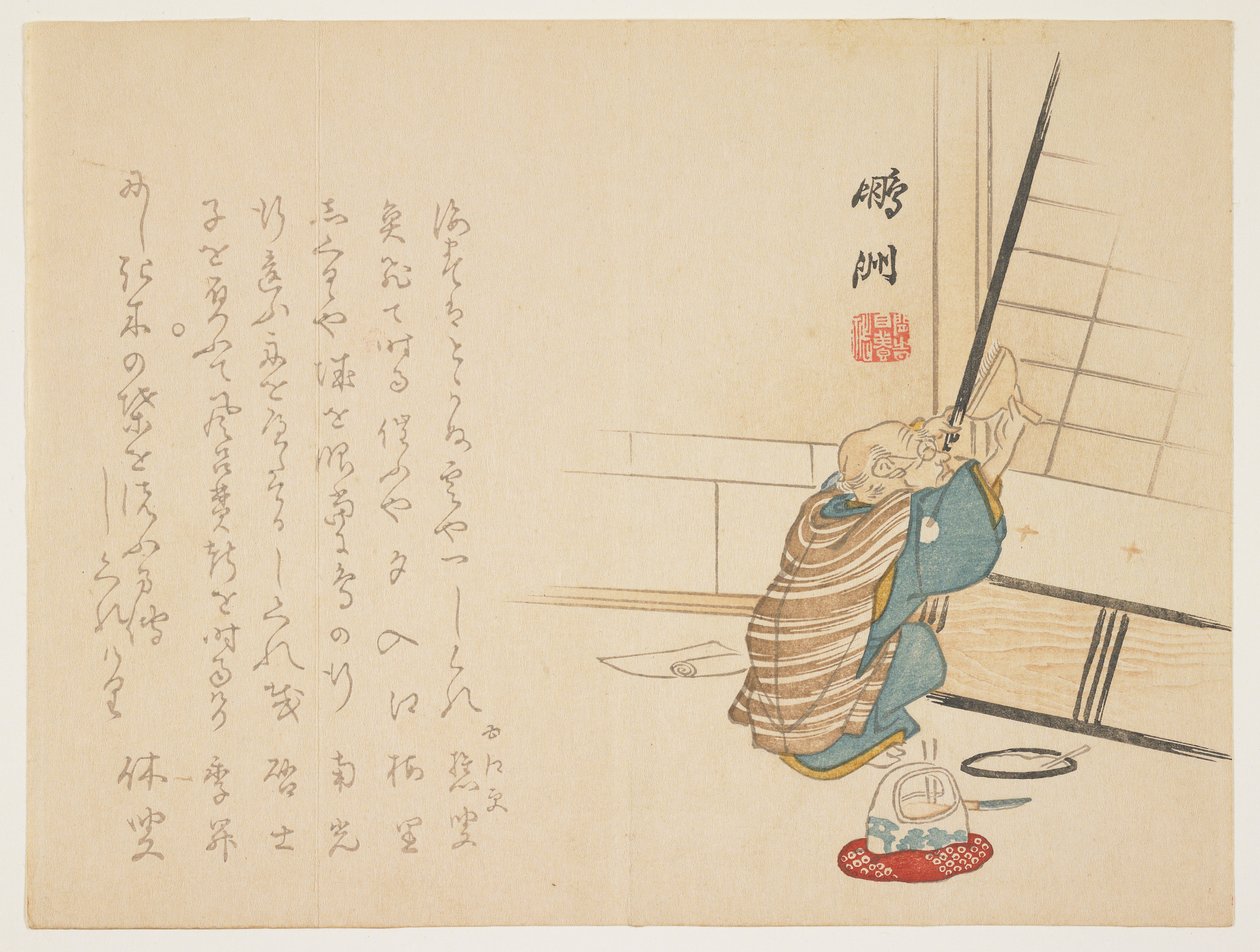 Gammel mand reparerer en sh?ji-skærm, ca. 1848-53 (træblok i farver)(Old man repairing a sh?ji screen, c.1848-53 (colour woodblock print))Ho Shu |