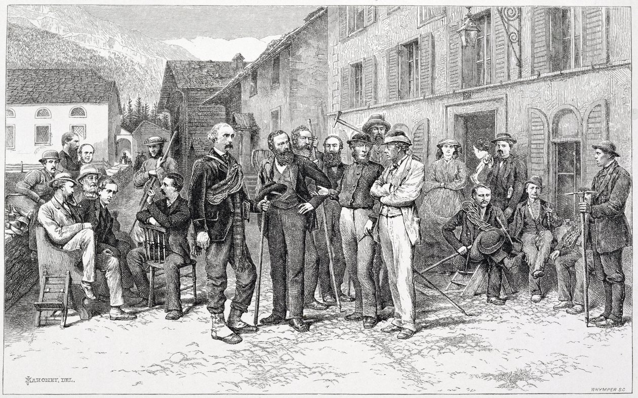 The Club Room of Zermatt i 1864, fra 'The Ascent of the Matterhorn' indgraveret af Edward Whymper (1840-1911), udgivet 1860'erne-80'erne(The Club Room of Zermatt in 1864, from 'The Ascent of the Matterhorn' engraved by Edward Whymper (1840-1911), published 1860s-80s )James Mahoney |