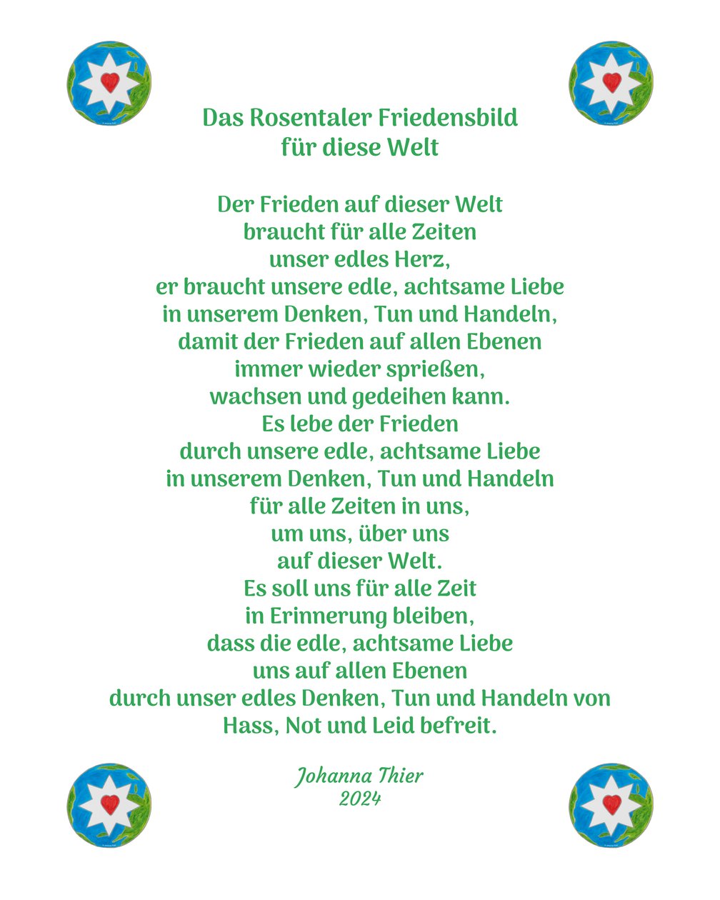 Måtte Johanna Thiers fredsbillede altid give mennesker stof til eftertanke på alle niveauer i alle udfordrende tider og situationer, så de altid kan leve kærligheden i deres tanker, handlinger og adfærd for at opretholde fred og en sund Moder Jord herhjemme og i alle lande. Længe leve kærligheden på alle niveauer til evig tid, længe leve freden på alle niveauer til evig tid i alle lande i denne verden.