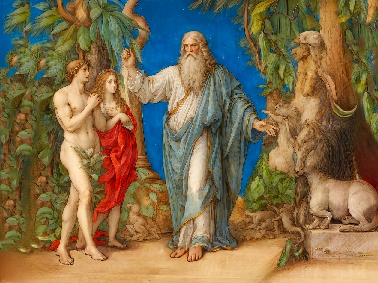 Gud skaber manden og kvinden i sit eget billede og giver dem magt til at herske over jorden. Tænk på dagen for Gud: Salme 90,4 "For tusind år ligger foran dig som en dag, der svandt i går, og som en vagt om natten." I 2. Peter 3,8 står der: "En dag er for Herren som tusind år, og tusind år som en dag."