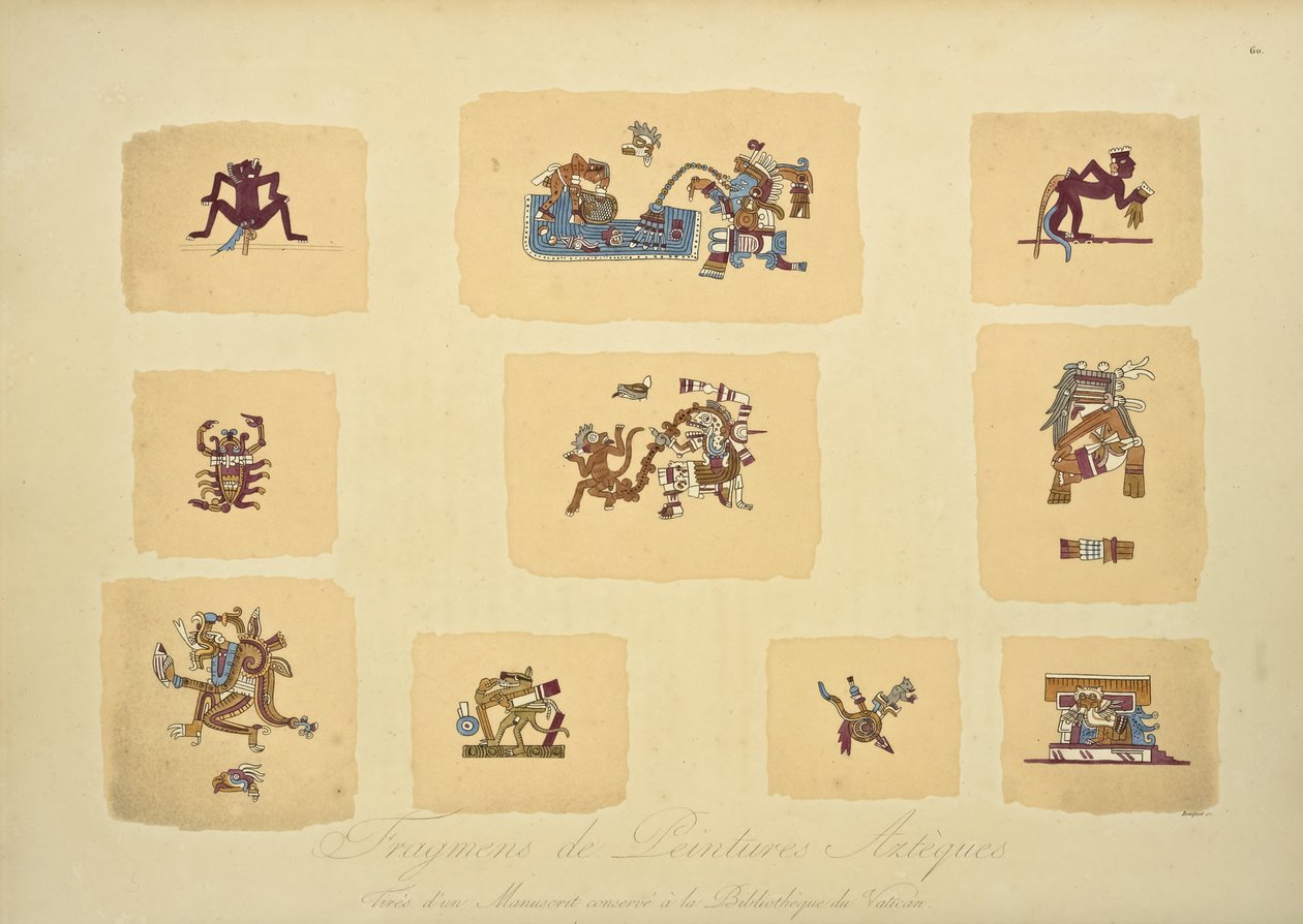 Fragmenter af aztekiske malerier, fra manuskriptet bevaret i Vatikanets bibliotek, illustration fra Views of the Cordilleras and Monuments of the Indigenous Peoples of America af Alexander von Humboldt og(Fragments of Aztec Paintings, from the Manuscript Conserved in the Vatican Library, illustration from Vues des Cordillères et Monumens des Peuples Indigènes de lAmérique by Alexander von Humboldt and )Louis Bouquet |