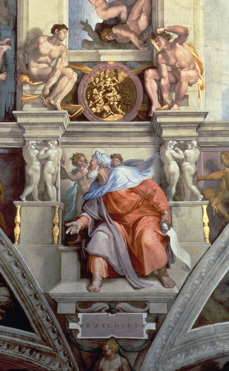 Det Sixtinske Kapels loft: Ezekiel, 1510, fresko efter restaurering af 76588(Sistine Chapel Ceiling: The Prophet Ezekiel, 1510 fresco post restoration detail of 76588)Michelangelo Buonarroti |