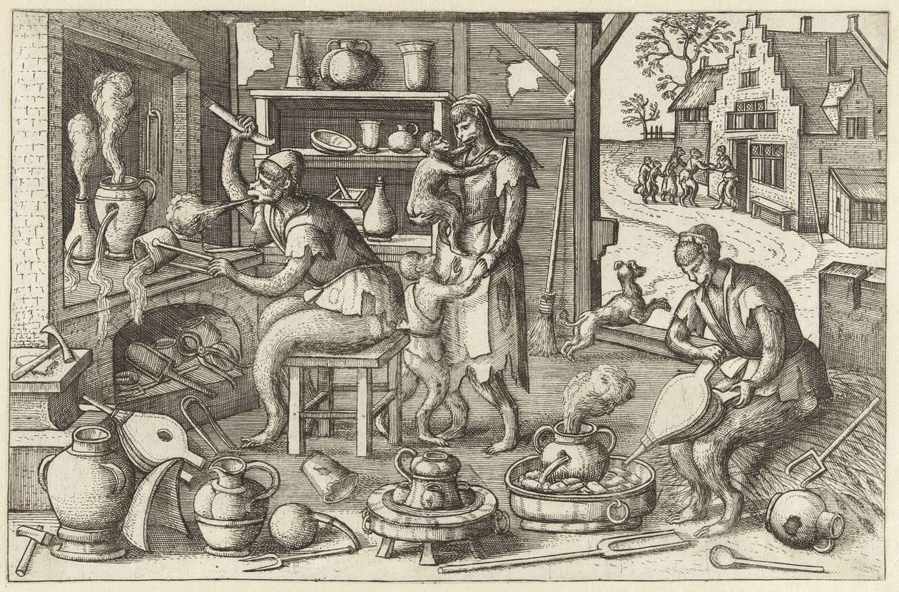 Alkymist Apenspel (serietitel)(Alchemist Apenspel (series title))Pieter van der Borcht (I)(print maker),Philips Galle(after print by),Pieter Bruegel (I)(after drawing by) |