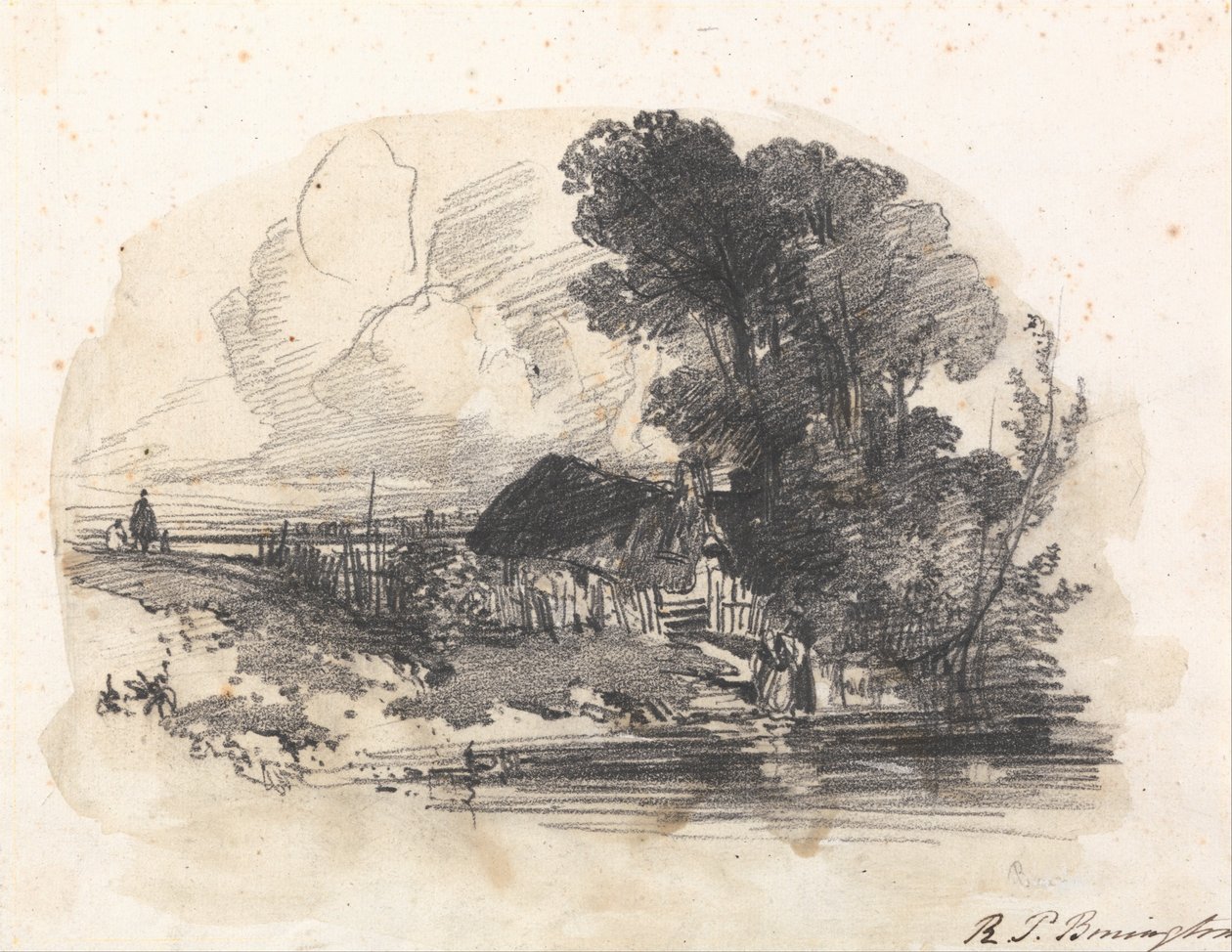 Træer og et sommerhus ved en flod(Trees and a Cottage by a River)Richard Parkes Bonington |