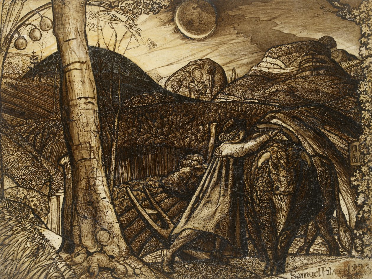 En rustik scene, 1823 (pen og pensel i sepia)(A Rustic Scene, 1823 (pen and brush in sepia))Samuel Palmer |