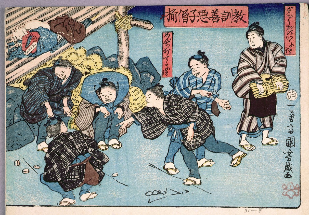 Moralsk undervisning for shopboys, der giver gode og dårlige eksempler på adfærd, 1857 (træblok i farver)(Moral teaching for shopboys, giving good and bad examples of behaviour, 1857 (colour woodblock print))Utagawa Kuniyoshi |